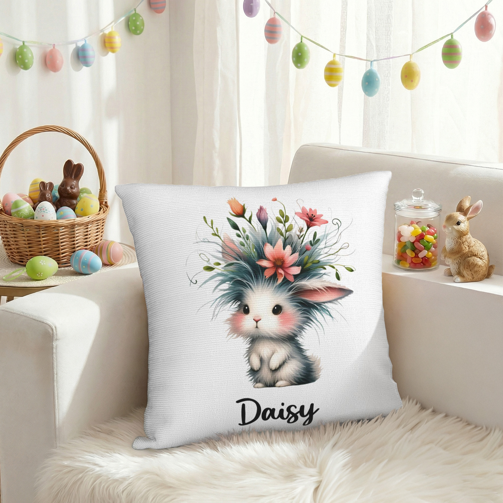 Floral Bunny Design - This throw pillow cover features a playful bunny surrounded by colorful flowers, creating a cheerful and quirky look that brings warmth and charm to any bedroom, playroom, or cozy corner.